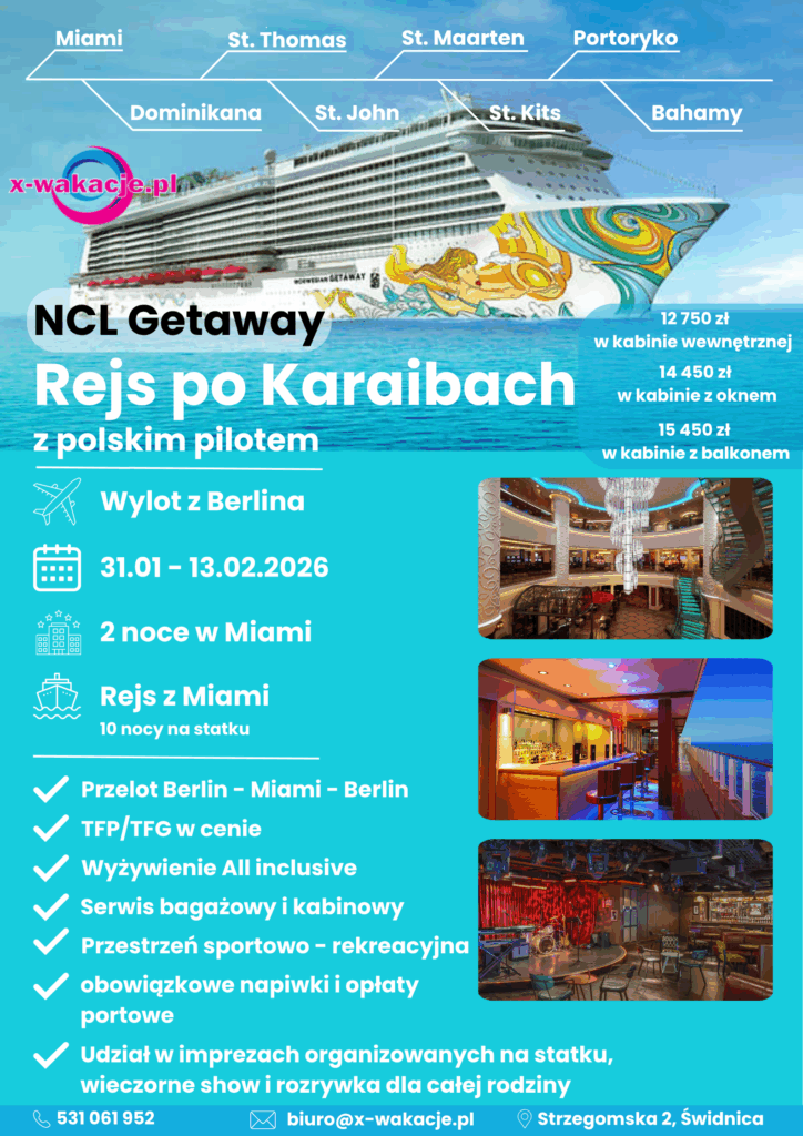 Zanurz się w Morzu Karaibskim i zwiedzaj świat podczas rejsu statkiem NCL. W dniach 31 stycznia – 13 luty 2026 soędzimy zimowe ferie w wyjątkowej karaibskiej scenerii.